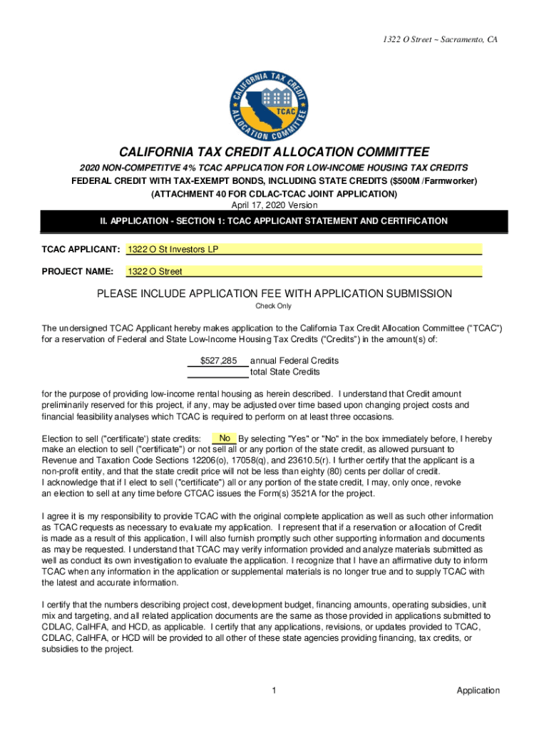 1322 O Street Sacramento, CALIFORNIA TAX CREDIT ALLOCATION COMMITTEE 2020 NONCOMPETITIVE 4% CAC APPLICATION FOR INCOME HOUSING TAX CREDITS FEDERAL CREDIT WITH TAX-EXEMPT BONDS, INCLUDING STATE CREDITS