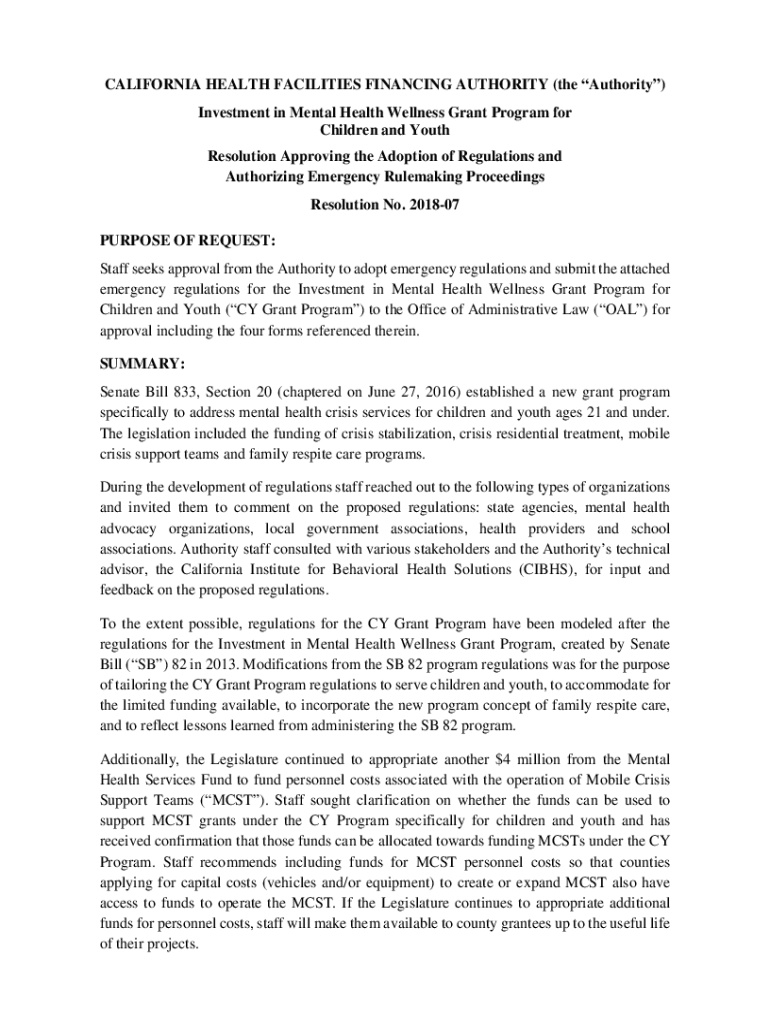 CALIFORNIA HEALTH FACILITIES FINANCING AUTHORITY (the Authority) Investment in Mental Health Wellness Grant Program for Children and Youth Resolution Approving the Adoption of Regulations and Authorizing