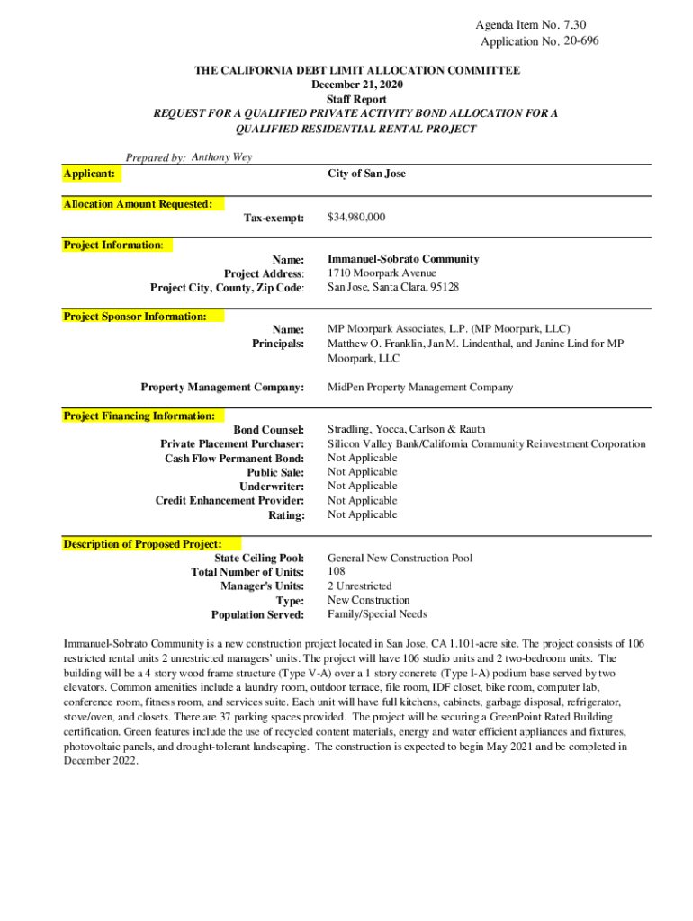 Agenda Item No. 7.30 Application No. 20696 THE CALIFORNIA DEBT LIMIT ALLOCATION COMMITTEE December 21, 2020, Staff Report REQUEST FOR A QUALIFIED PRIVATE ACTIVITY BOND ALLOCATION FOR A QUALIFIED RESIDENTIAL