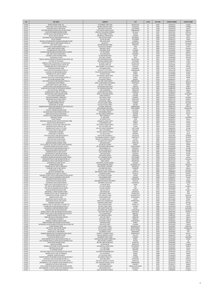 CCN SNF NAMEADDRESSCITYSTATEZIP TELEPHONE NUMBERCOUNTY NAME015009 015010 015012 015014 015015 015016 015023 015027 015028 015031 015034 015035 015042 015045 015048 015049 015050 015053 015063 015066
