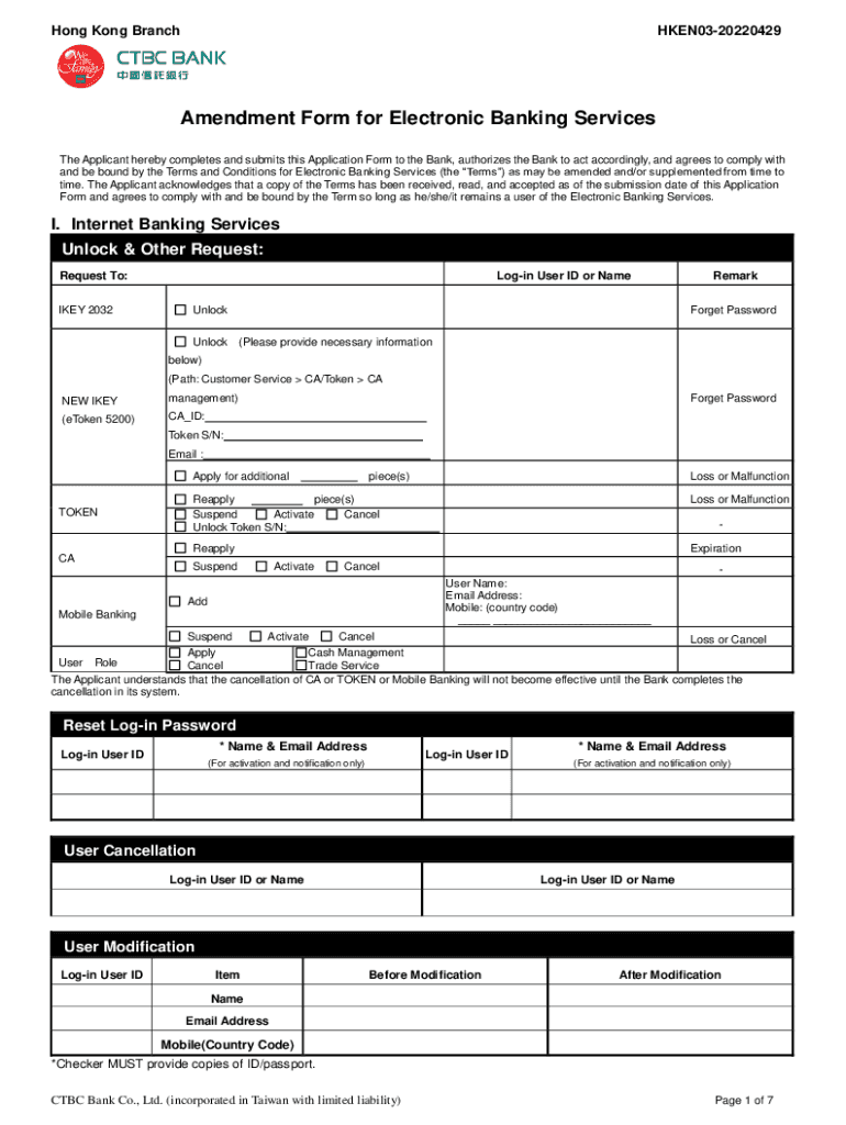 Hong Kong BranchHKEN0320220429Amendment Form for Electronic Banking Services The Applicant hereby completes and submits this Application Form to the Bank, authorizes the Bank to act accordingly, and