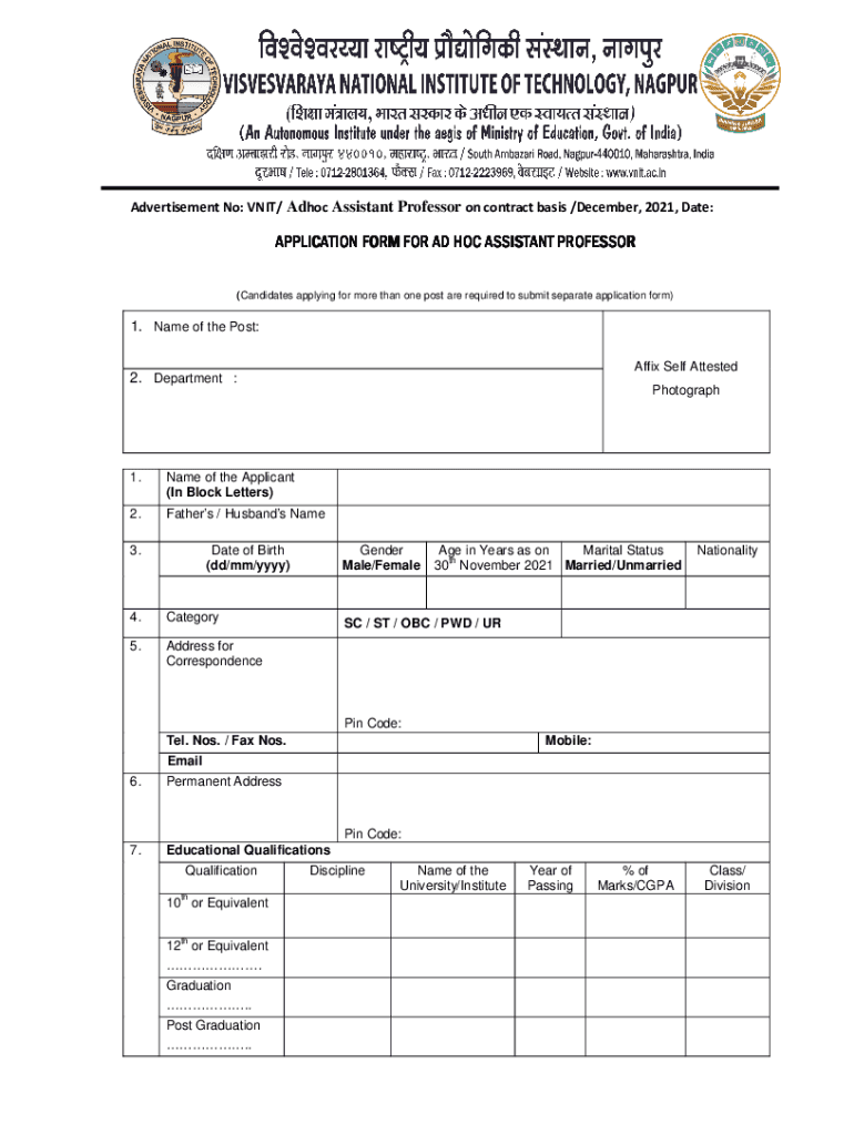 Advertisement No: UNIT/ Ad hoc Assistant Professor on contract basis /December 2021, Date:APPLICATION FORM FOR AD HOC ASSISTANT PROFESSOR (Candidates applying for more than one post are required to