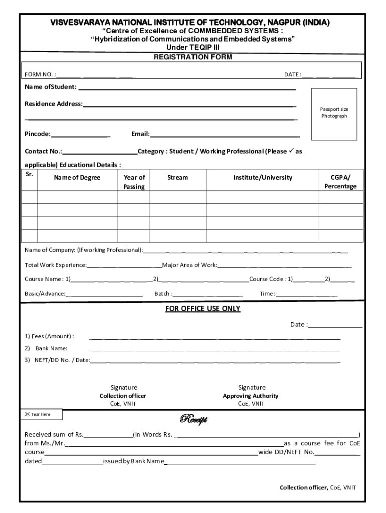 VISVESVARAYA NATIONAL INSTITUTE OF TECHNOLOGY, NAGPUR (INDIA) Center of Excellence of COMMENDED SYSTEMS : Hybridization of Communications and Embedded Systems Under TEQ IP III REGISTRATION FORM NO.