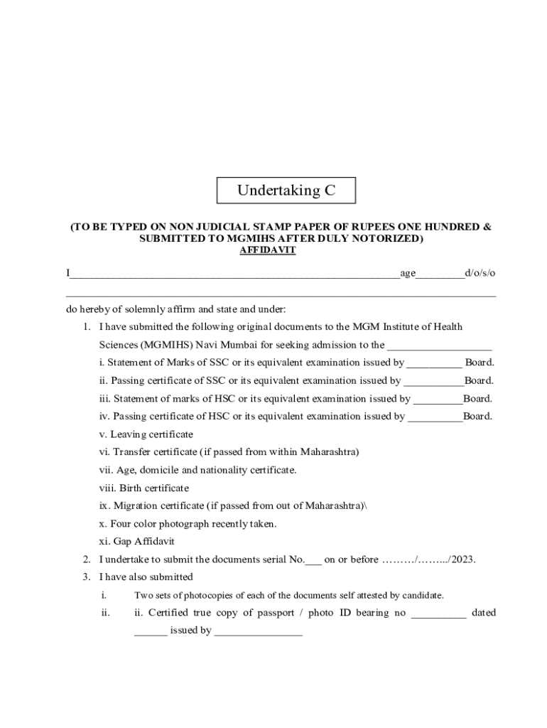 Undertaking C (TO BE TYPED ON NON-JUDICIAL STAMP PAPER OF RUPEES ONE HUNDRED & SUBMITTED TO MGM IHS AFTER DULY MOTORIZED) AFFIDAVITI___age___d/o/s/o ___ do hereby of solemnly affirm and state and
