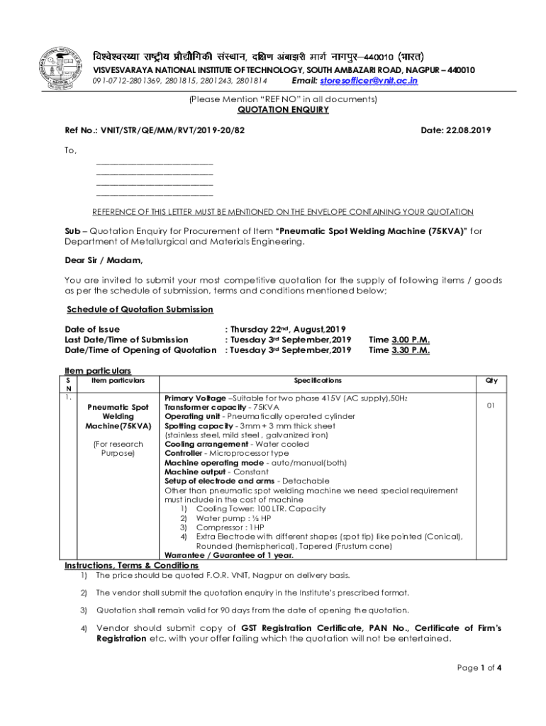 Get the free Qotation Enquiry for Pneumatic Spot Welding Machine 75 KVA-MME department