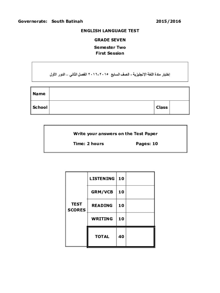 Governorate:South Batinah2015/2016ENGLISH LANGUAGE TEST GRADE SEVEN Semester Two First Session 20162015 Name SchoolClassWrite your answers on the Test Paper Time: 2 hostages: 10LISTENING 10TEST SCORES/VCB10READING10WRITING10TOTAL40ENGLISH,