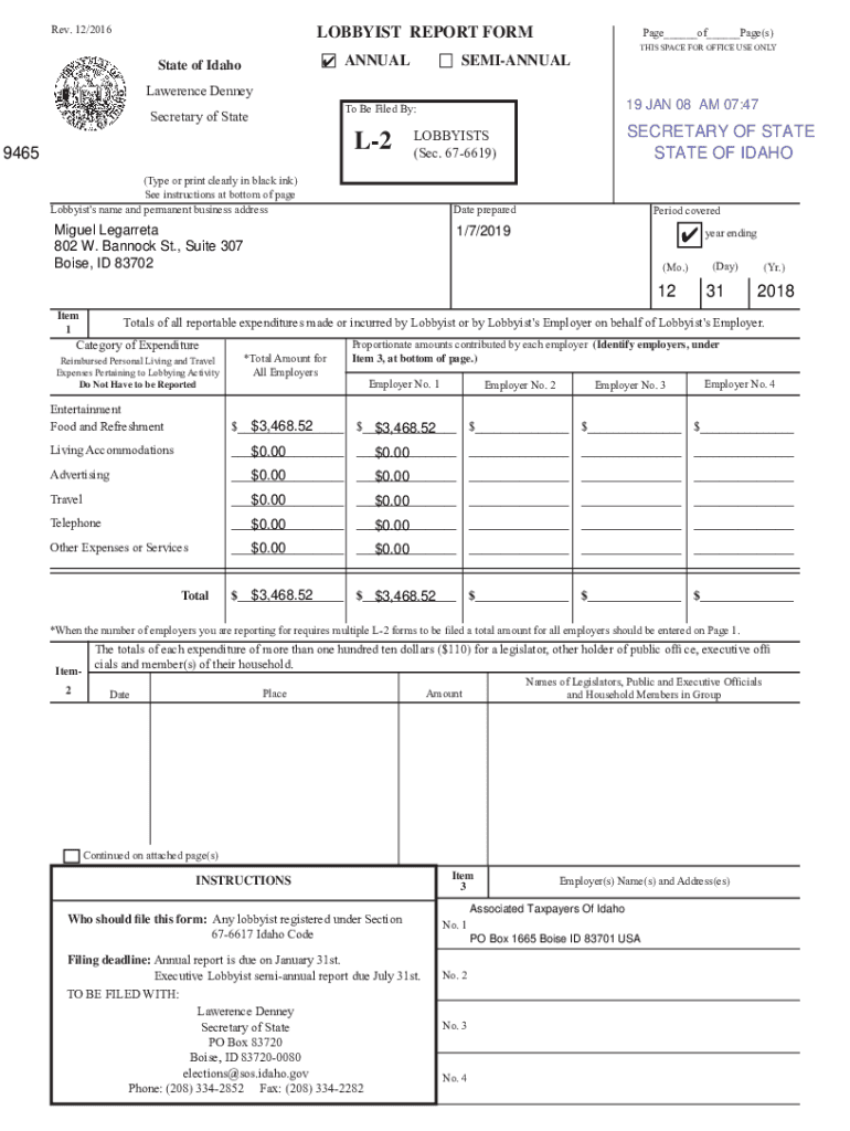 Rev. 12/2016Page___of___Page(s)LOBBYIST REPORT FORMS SPACE FOR OFFICE USE ONLY ANNUALState of IdahoSEMIANNUALLawerence Denney19 JAN 08 AM 07:47To Be Filed By:Secretary of StateL29465SECRETARY OF STATE