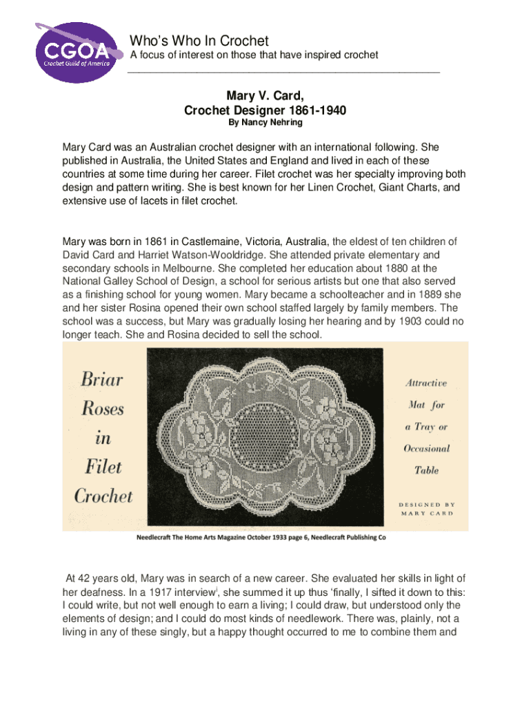 Who's Who In Crochet A focus of interest on those that have inspired crochet ___Mary V. Card, Crochet Designer 18611940 By Nancy NehringMary Card was an Australian crochet designer with an international