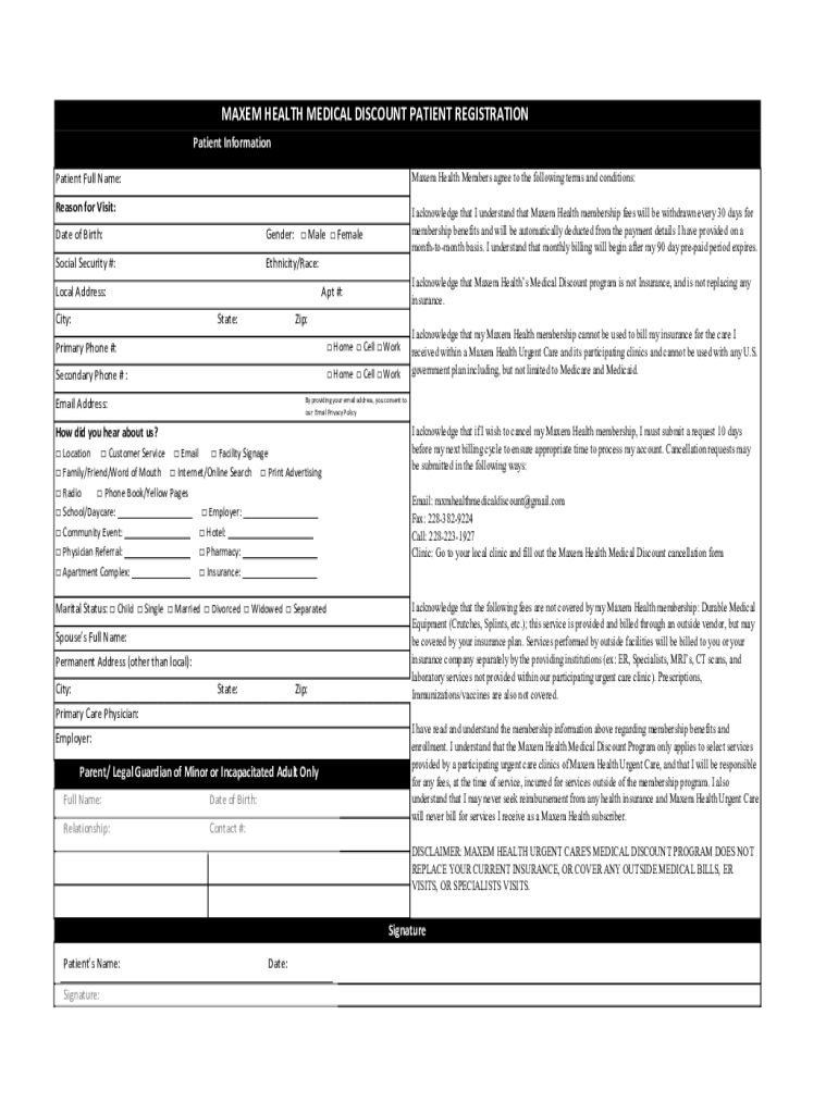 MAXIM HEALTH MEDICAL DISCOUNT PATIENT REGISTRATION Patient Information Patient Full Name:Maxim Health Members agree to the following terms and conditions:Reason for Visit: Date of Birth:Gender: Male