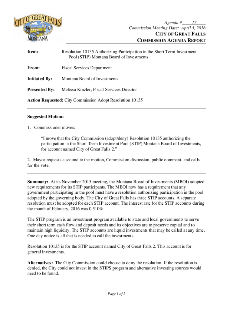 Agenda # 17 Commission Meeting Date: April 5, 2016CITY OF GREAT FALLS COMMISSION AGENDA REPORT Item:Resolution 10135 Authorizing Participation in the Short Term Investment Pool (STOP) Montana Board