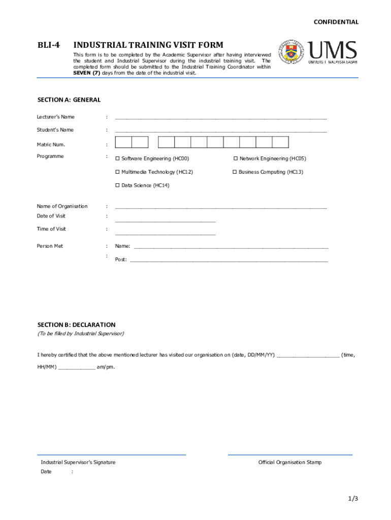 CONFIDENTIALBLI4INDUSTRIAL TRAINING VISIT FORM This form is to be completed by the Academic Supervisor after having interviewed the student and Industrial Supervisor during the industrial training