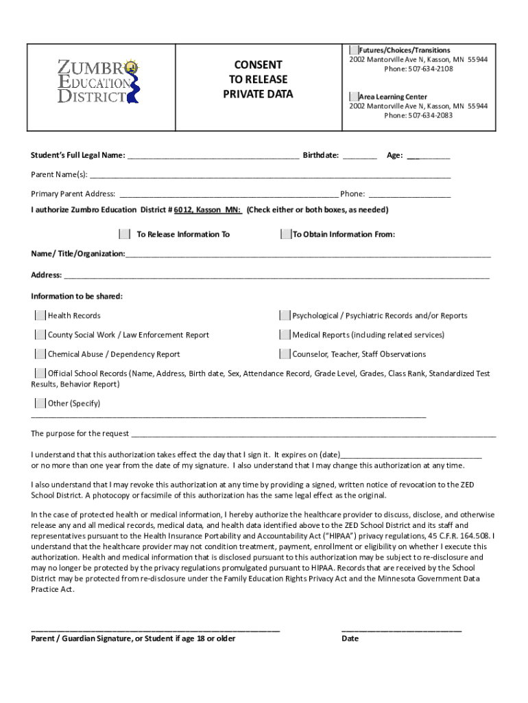 CONSENT TO RELEASE PRIVATE DATAFutures/Choices/Transitions 2002 Mandeville Ave N, Lesson, MN 55944 Phone: 5076342108Area Learning Center 2002 Mandeville Ave N, Lesson, MN 55944 Phone: 5076342083Students