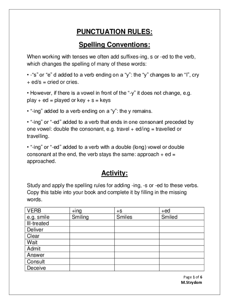 PUNCTUATION RULES: Spelling Conventions: When working with tenses we often add suffixing, s or ed to the verb, which changes the spelling of many of these words: s or e d added to a verb ending on
