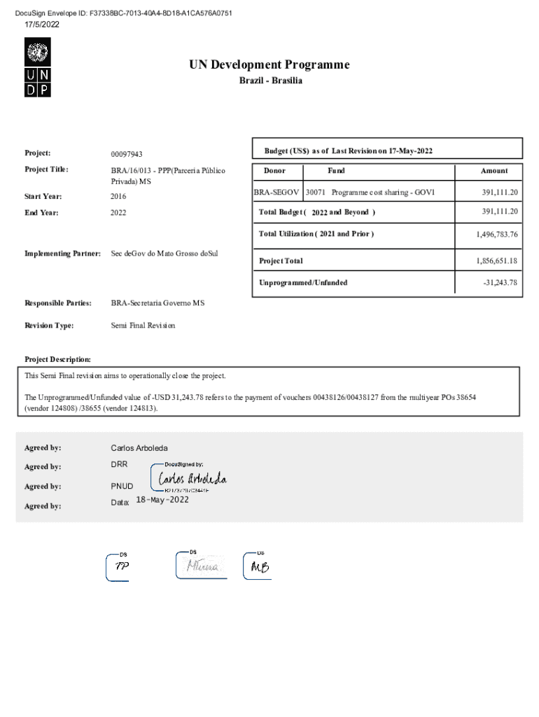 Brazil BrasiliaProject:00097943Budget (US$) as of Last Revision on 17May2022Project Title:BRA/16/013 PPP(Parker