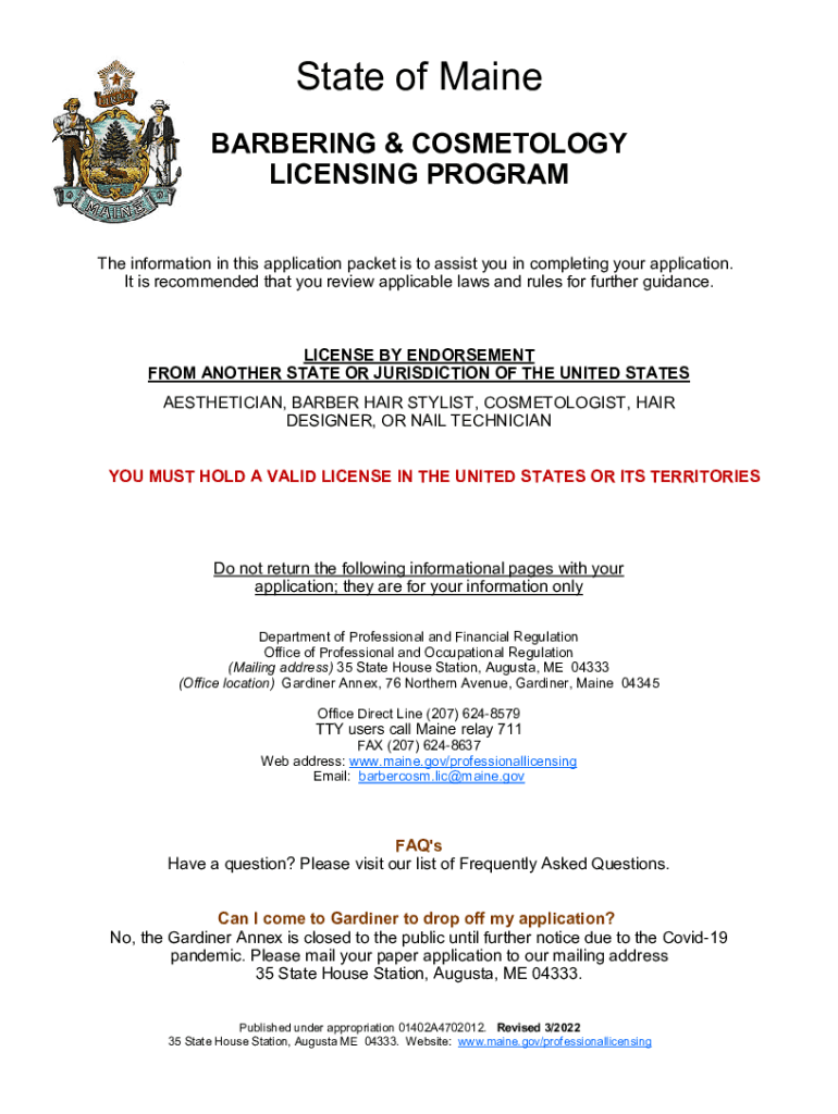 State of Maine BARBERING & COSMETOLOGY LICENSING PROGRAM The information in this application packet is to assist you in completing your application. It is recommended that you review applicable laws