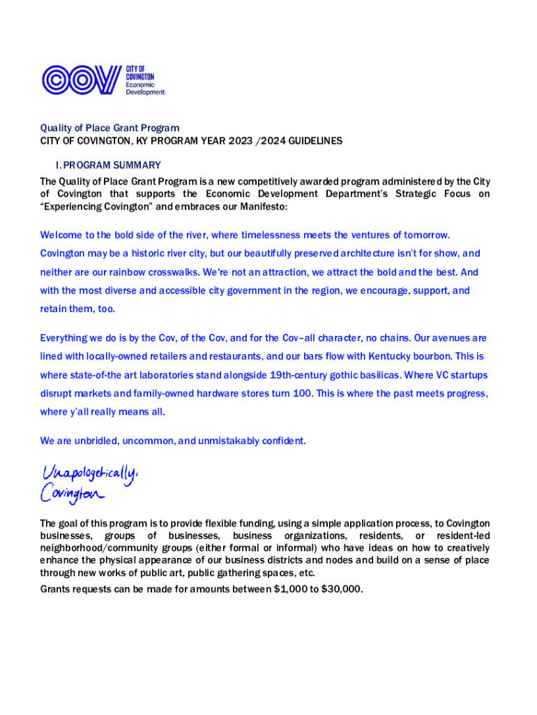 Quality of Place Grant Program CITY OF COVINGTON, KY PROGRAM YEAR 2023 /2024 GUIDELINES I. PROGRAM SUMMARY The Quality of Place Grant Program is a new competitively awarded program administered by