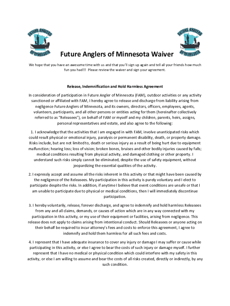 Future Anglers of Minnesota Waiver We hope that you have an awesome time with us and that you'll sign up again and tell all your friends how much fun you had!!! Please review the waiver and sign your