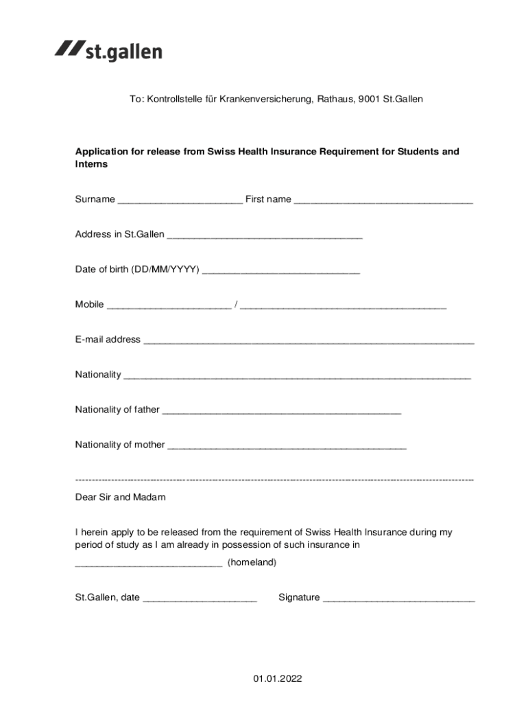 To: Kontrollstelle for Krankenversicherung, Bauhaus, 9001 St. GallenApplication for release from Swiss Health Insurance Requirement for Students and InternsSurname ___ First name ___Address in St.