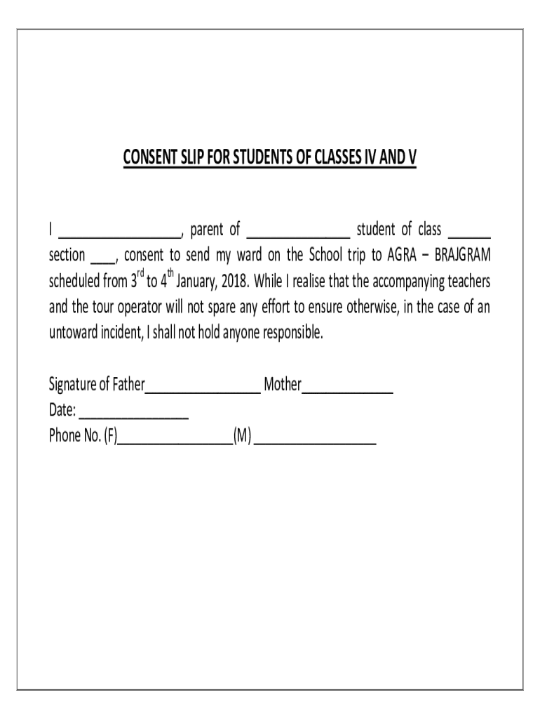 CONSENT SLIP FOR STUDENTS OF CLASSES IV AND V I ___, parent of ___ student of class ___ section ___, consent to send my ward on the School trip to AGRA PROGRAM scheduled from 3rd to 4th January 2018.