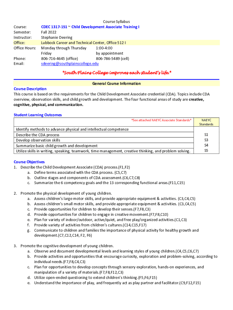 Course: Semester: Instructor: Office: Office Hours: Phone: Email:Course Syllabus CDEC 1317151 Child Development Associate Training I Fall 2022 Stephanie Deeming Lubbock Career and Technical Center,
