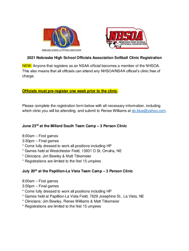 2021 Nebraska High School Officials Association Softball Clinic Registration NEW: Anyone that registers as an NASA official becomes a member of the NH SOA. This also means that all officials can attend