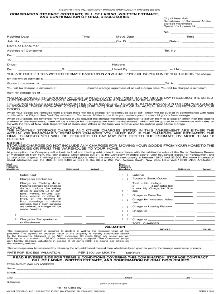 MIL BIN PRINTING INC., 1290 MOTOR PARKWAY, HAULAGE, NY 11749 (631) 5828900COMBINATION STORAGE CONTRACT, BILL OF LADING, WRITTEN ESTIMATE,