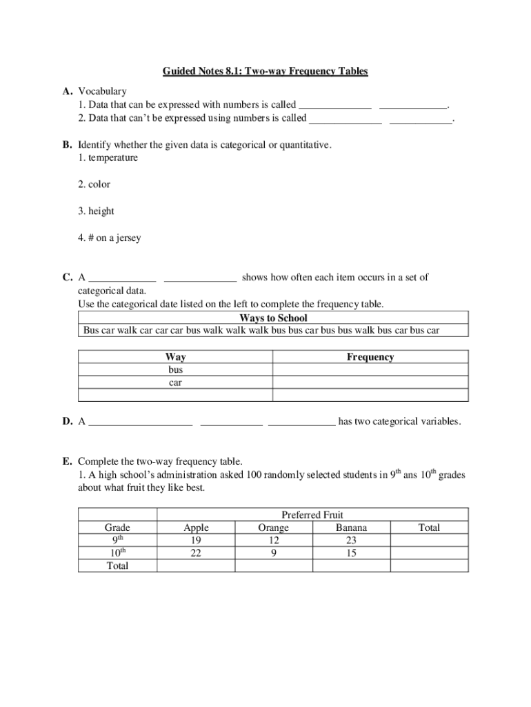 Guided Notes 8.1: Two way Frequency Tables A. Vocabulary 1. Data that can be expressed with numbers is called ___ ___. 2. Data that cant be expressed using numbers is called ___ ___. B. Identify whether