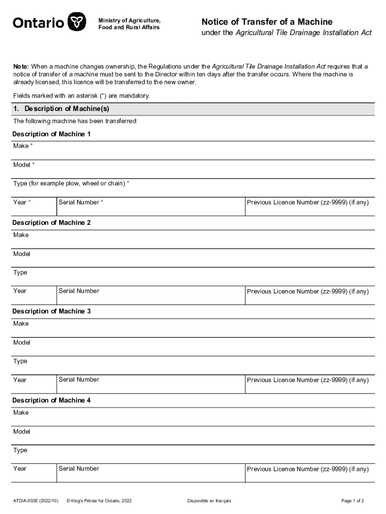Ministry of Agriculture, Food and Rural AffairsNotice of Transfer of a Machine under the Agricultural Tile Drainage Installation Actuate: When a machine changes ownership, the Regulations under the
