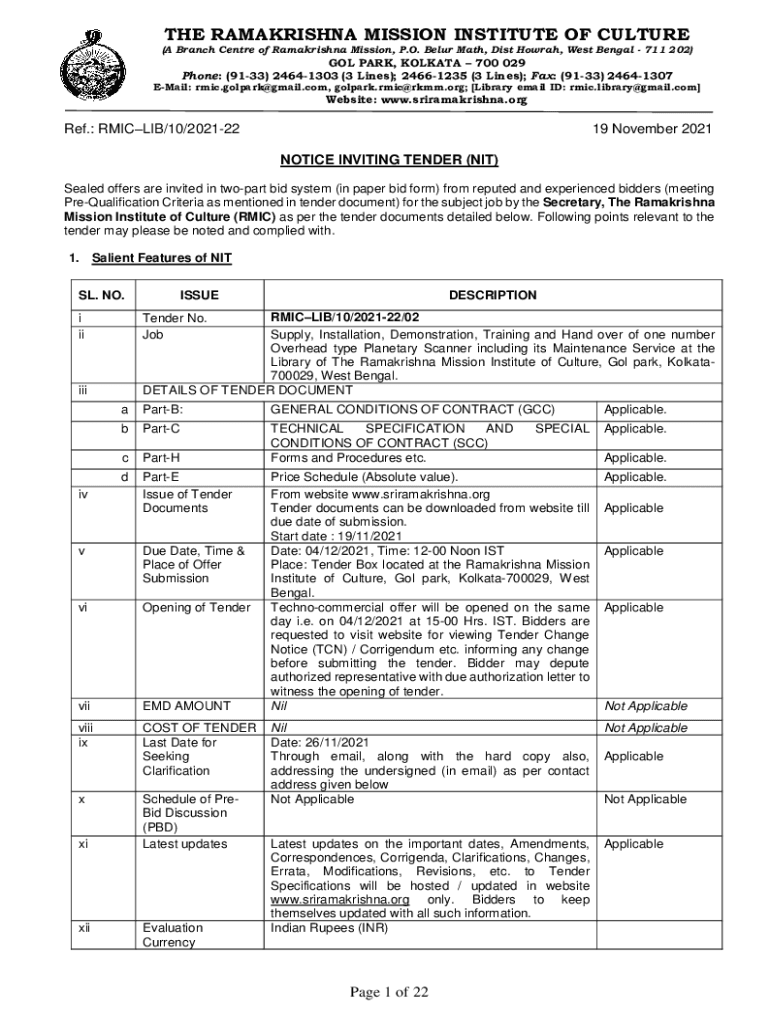 THE RAMAKRISHNA MISSION INSTITUTE OF CULTURE (A Branch Center of Ramakrishna Mission, P.O. Blur Math, Dist Howrah, West Bengal 711 202)GO PARK, KOLKATA 700 029 Phone: (9133) 24641303 (3 Lines); 24661235