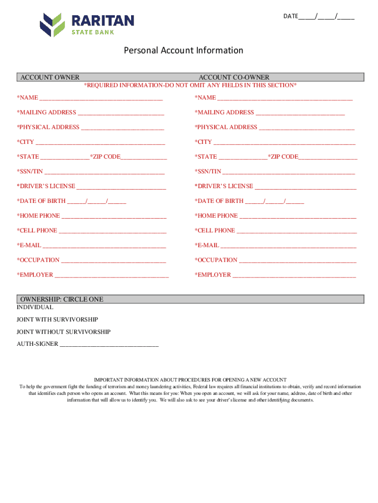 DATE___/___/___Personal Account Information ACCOUNT OWNERACCOUNT CORNER *REQUIRED INFORMATION DO NOT OMIT ANY FIELDS IN THIS SECTION**NAME ___*NAME ___*MAILING ADDRESS ___*MAILING ADDRESS ___*PHYSICAL