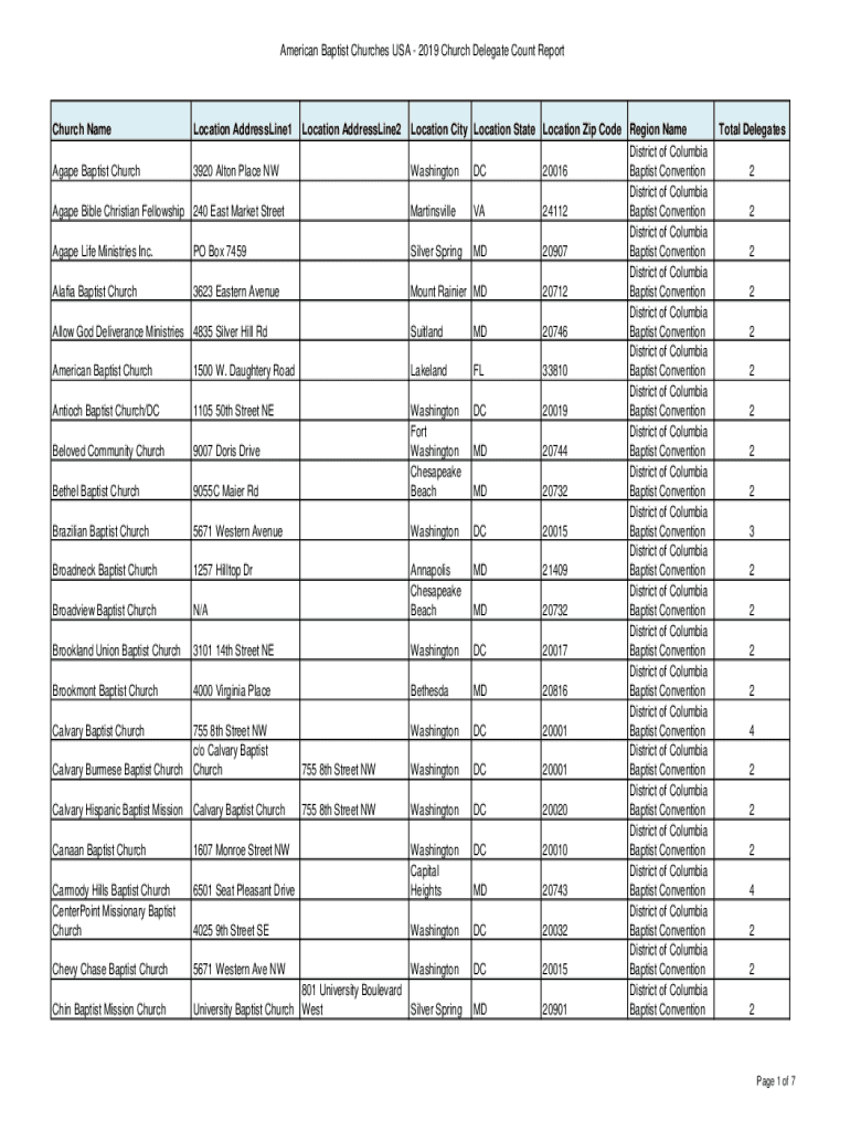 American Baptist Churches USA 2019 Church Delegate Count Report Church Allocation AddressLine1Location AddressLine2Location City Location State Location Zip Code Region Name District of Columbia Agape