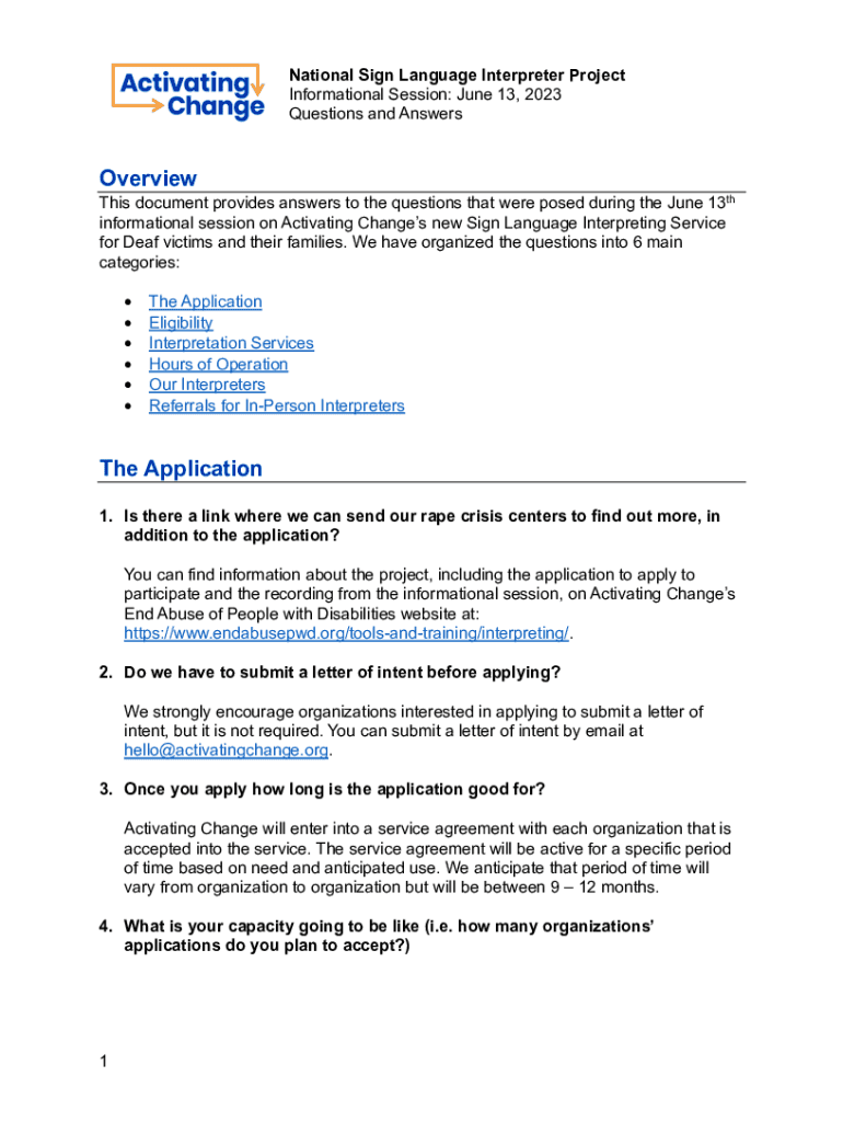 National Sign Language Interpreter Project Informational Session: June 13, 2023, Questions and AnswersOverview This document provides answers to the questions that were posed during the June 13th