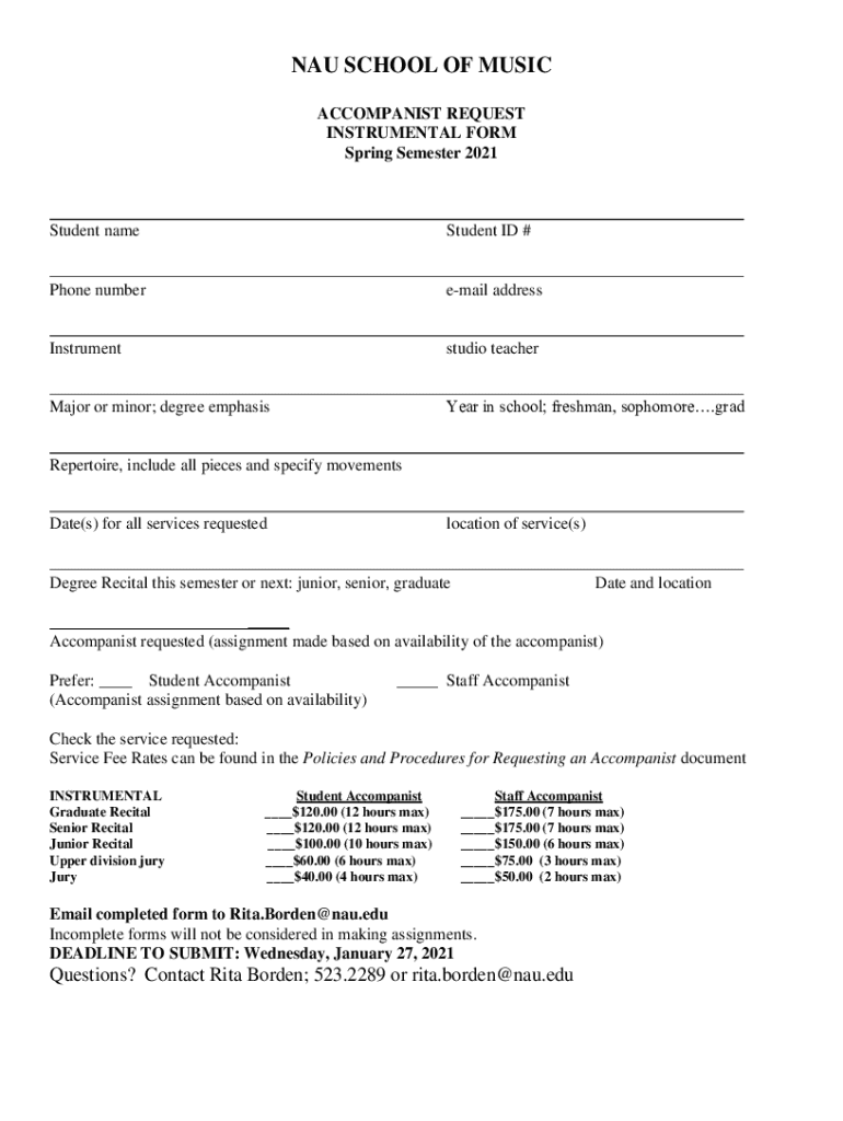 NAU SCHOOL OF MUSIC ACCOMPANIST REQUEST INSTRUMENTAL FORM Spring Semester 2021Student nameStudent ID #___ Phone number email addressInstrumentstudio teacher___ Major or minor; degree emphasis Year