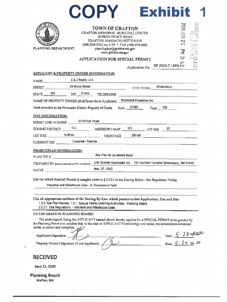 COPYExhibit 1 fly, `3TOWN OF GRAFTONPLANNING DEPARTMENToGRAFTON MEMORIAL MUNICIPAL CENTER 30 PROVIDENCE ROAD GRAFTON, MASSACHUSE1TS 01519 508 8395335 ext 1120 * FAX 508 8394602 plannlngdeptgraftonma.gov