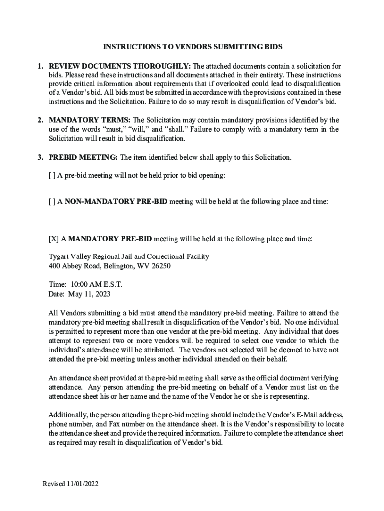 INSTRUCTIONS TO VENDORS SUBMITTING BIDS 1. REVIEW DOCUMENTS THOROUGHLY: The attached documents contain a solicitation for bids. Please read these instructions and all documents attached in their entirety.