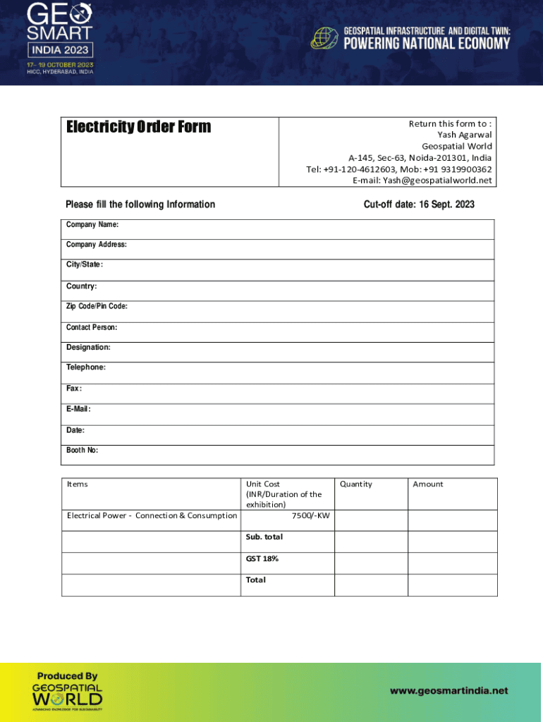 Electricity Order FormReturn this form to : Cash Agarwal Geospatial World A145, Sec63, Noida201301, India Tel: +911204612603, Mob: +91 9319900362 Email: Yash@geospatialworld.netPlease fill the following