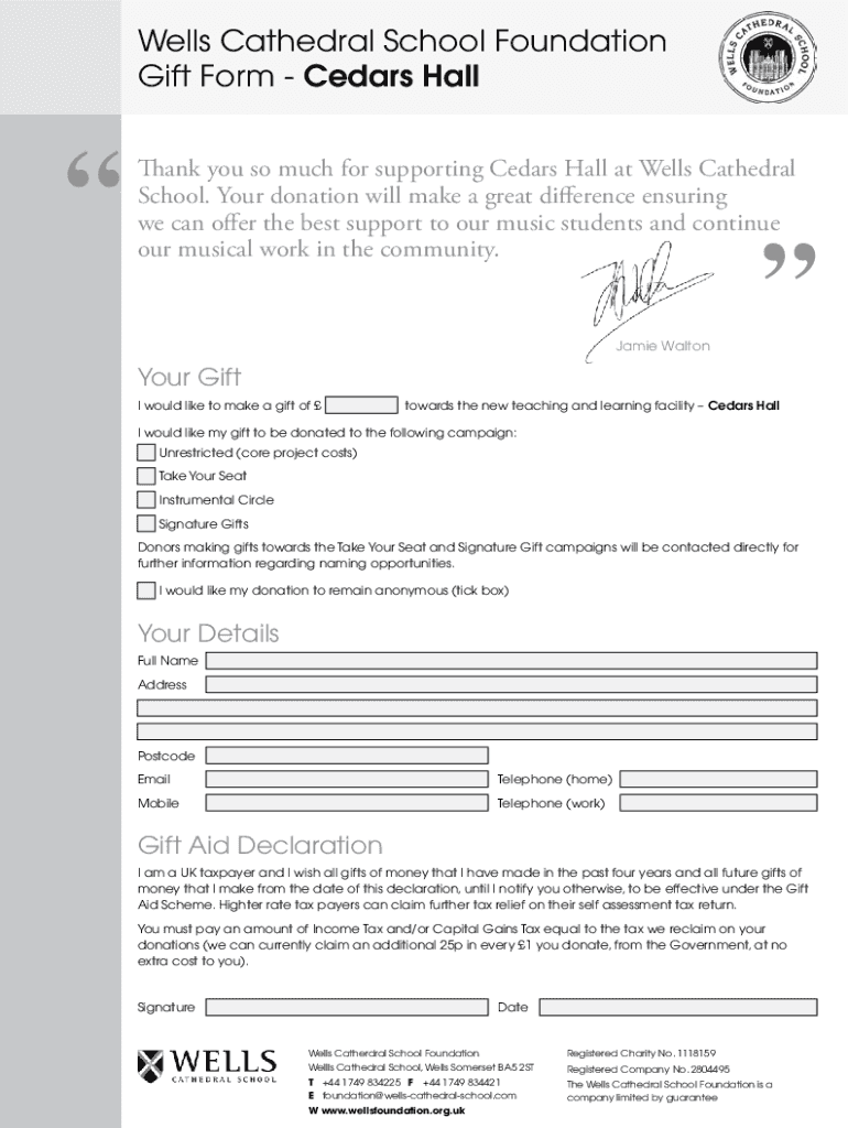 Wells Cathedral School Foundation Gift Form Cedars Hall Thank you so much for supporting Cedars Hall at Wells Cathedral School. Your donation will make a great difference ensuring we can offer the
