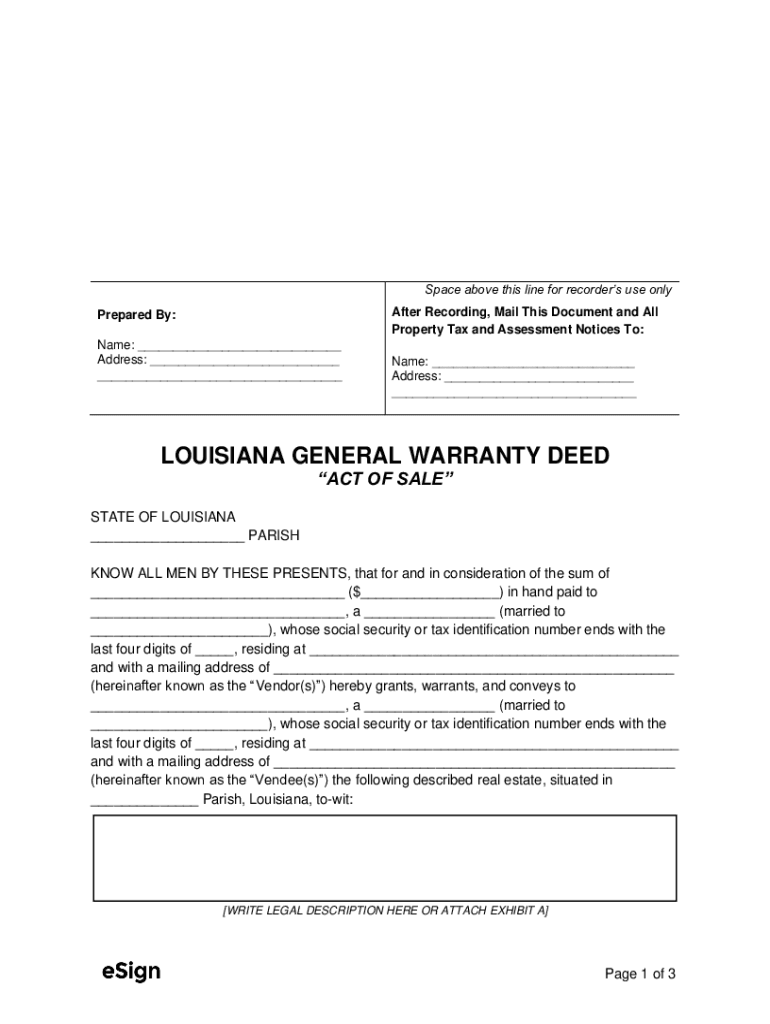 Space above this line for recorders use only After Recording, Mail This Document and All Property Tax and Assessment Notices To:Prepared By: Name: ___ Address: ___ ___Name: ___ Address: ___ ___LOUISIANA