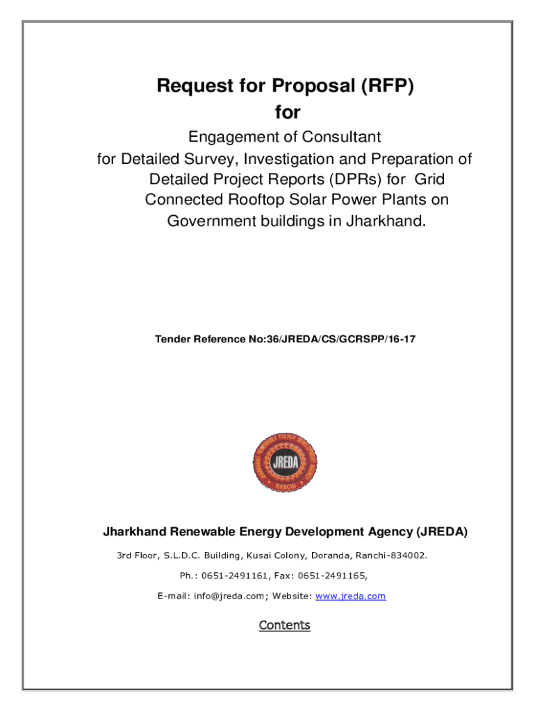 Request for Proposal (RFP) for Engagement of Consultant for Detailed Survey, Investigation and Preparation of Detailed Project Reports (GPRS) for Grid Connected Rooftop Solar Power Plants on Government