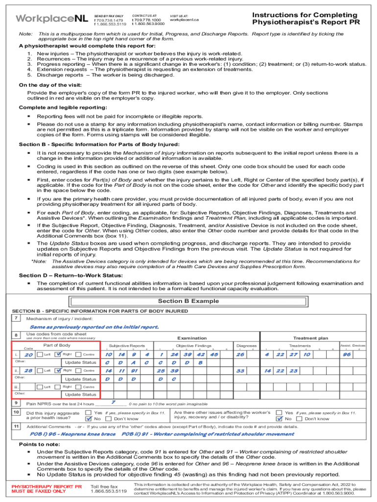 Note:SEND BY FAX NON-CONTACT US AT:VISIT US AT:f 709.738.1479 f 1.866.553.5119t 709.778.1000 t 1.800.563.9000workplacenl.instructions for Completing Physiotherapists Report PRT his is a multipurpose
