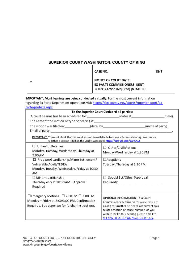 SUPERIOR COURT WASHINGTON, COUNTY OF KING CASE NO. vs. NOTICE OF COURT DATE EX PARTE COMMISSIONERS KENT (Clerk\'s Action Required) (NAMED)IMPORTANT: Most hearings are being conducted virtually. For
