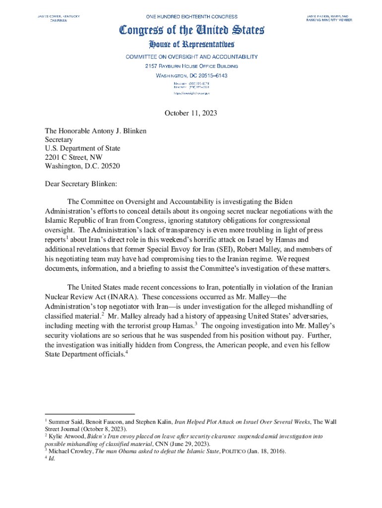October 11, 2023, The Honorable Antony J. Blinken Secretary U.S. Department of State 2201 C Street, NW Washington, D.C. 20520 Dear Secretary Blinken: The Committee on Oversight and Accountability
