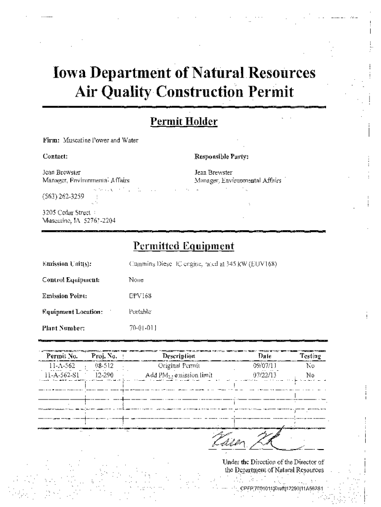 Iowa Department of Natural Resources Air Quality Construction Permit Holder Firm: Mescaline Power and Water Contact:Responsible Party:Jean Brewster Manager, Environmental Affairs Jean Brewster Manager,