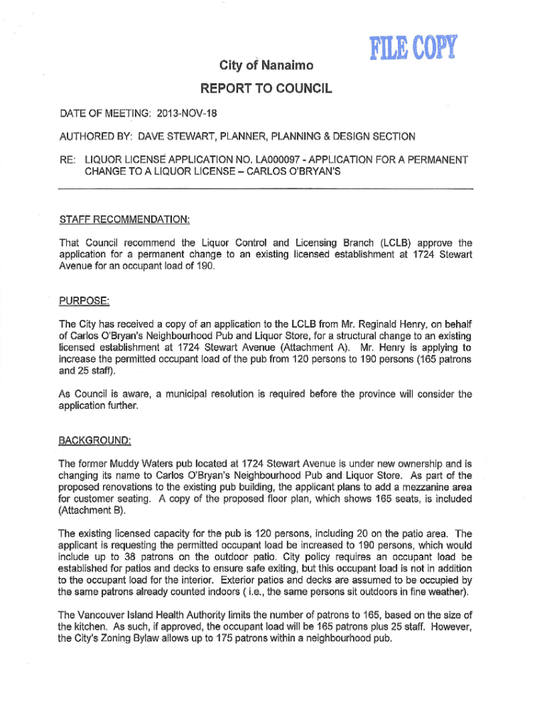 City of Nanaimo REPORT TO COUNCIL DATE OF MEETING: 2013NOV18 AUTHORED BY: DAVE STEWART, PLANNER, PLANNING & DESIGN SECTION RE:LIQUOR LICENSE APPLICATION NO. LA000097 APPLICATION FOR A PERMANENT CHANGE