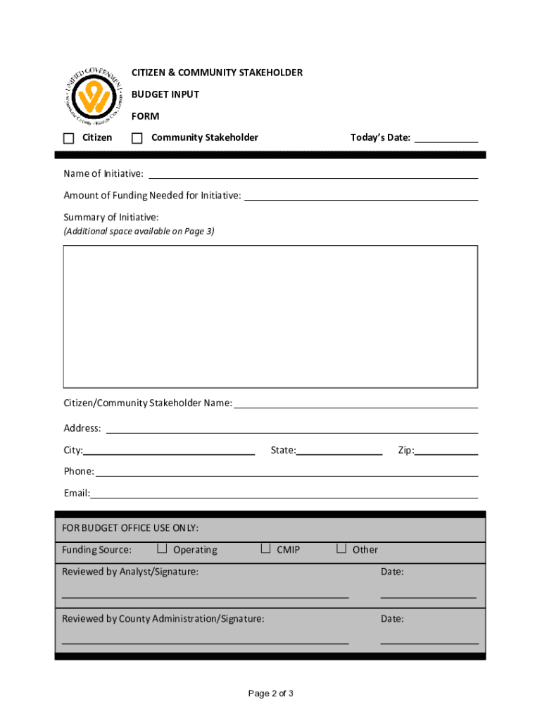 2021 Citizen & Community Stakeholder Budget Input Form Prepared by the Budget Officialese RETURN TO:Unified Government Budget Office Density Bush 701 N. 7th Street, Suite 510 Kansas City, KS 66101
