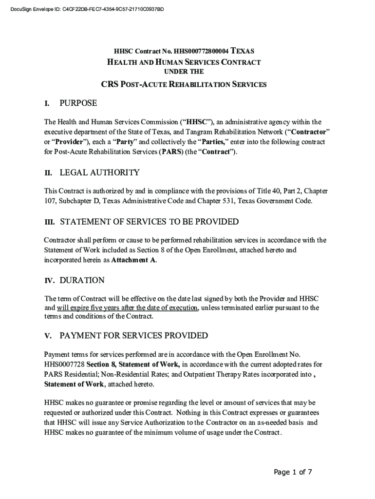 HHSC Contract No. HHS000772800004 TELEHEALTH AND HUMAN SERVICES CONTRACT UNDER THEIRS STATUTE REHABILITATION SERVICES I. Purpose Health and Human Services Commission (HHSC), an administrative agency