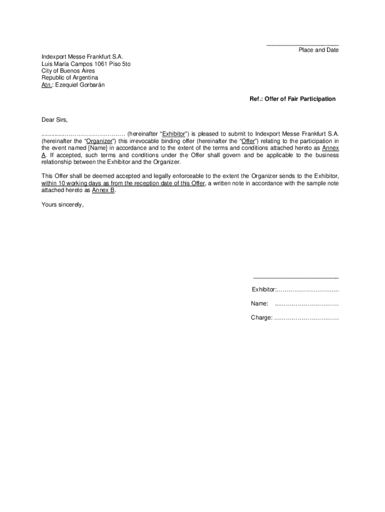 ___ Place and Date Ind export Jesse Frankfurt S.A. Luis Mara Campos 1061 Peso 5to City of Buenos Aires Republic of Argentina ATN.: Ezequiel Gorman Ref.: Offer of Fair ParticipationDear Sirs, ...............