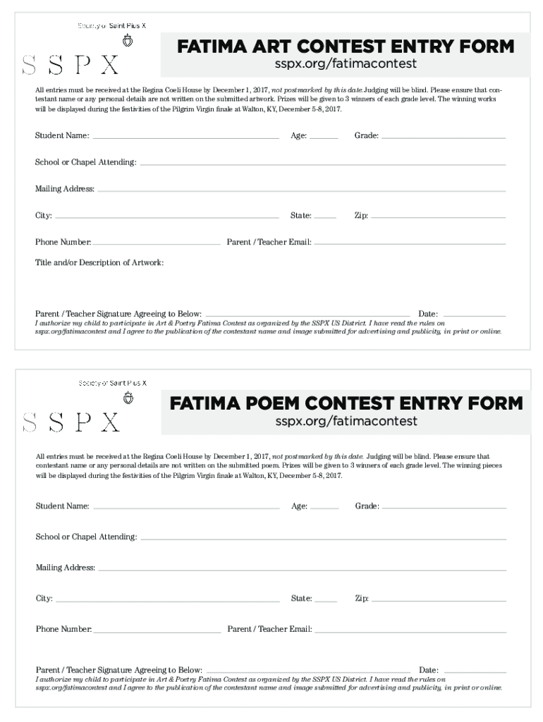 FATIMA ART CONTEST ENTRY FORM sspx.org/fatimacontest All entries must be received at the Regina Could House by December 1, 2017, not postmarked by this date. Judging will be blind. Please ensure that