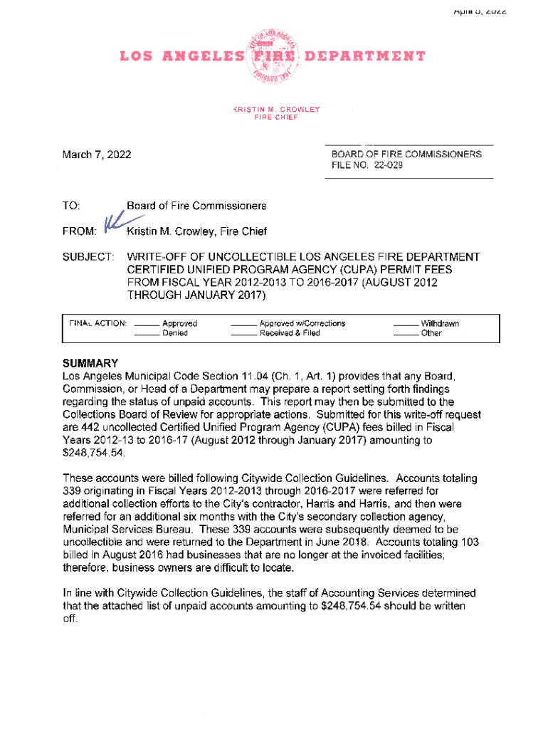 Get the free Write Off of Uncollectible LAFD CUPA Permit Fees from ... - ens lacity