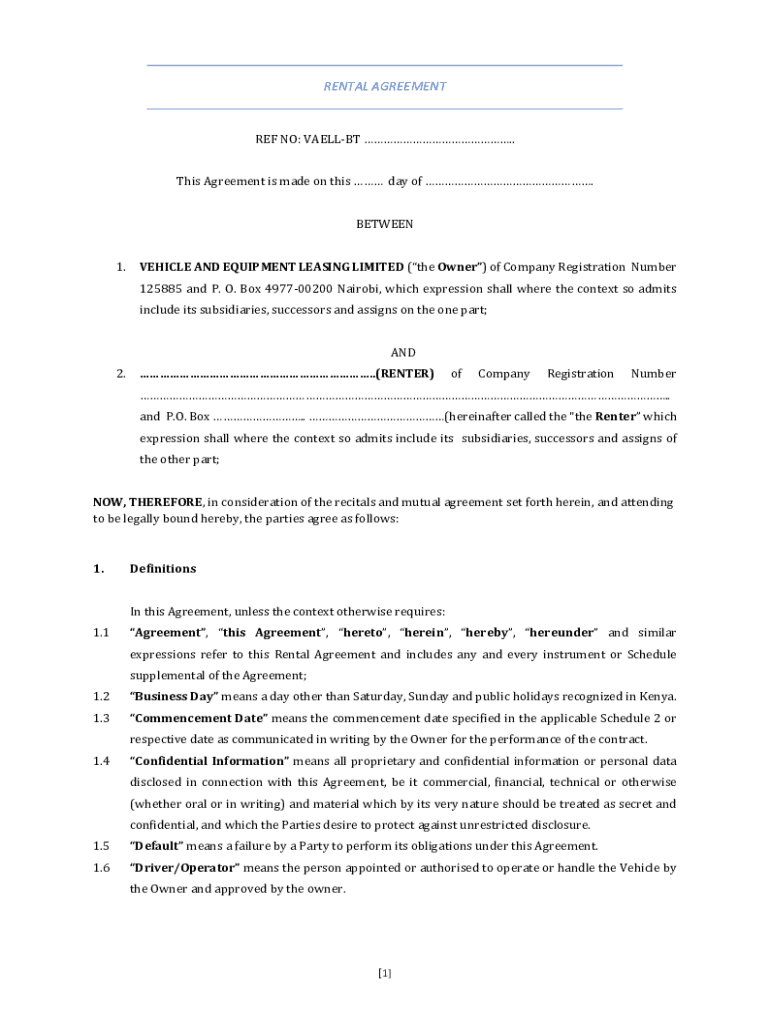 RENTAL AGREEMENT NO: VALLEY. This Agreement is made on this day of. BETWEEN1.VEHICLE AND EQUIPMENT LEASING LIMITED (the Owner) of Company Registration Number 125885 and P. O. Box 497700200 Nairobi,